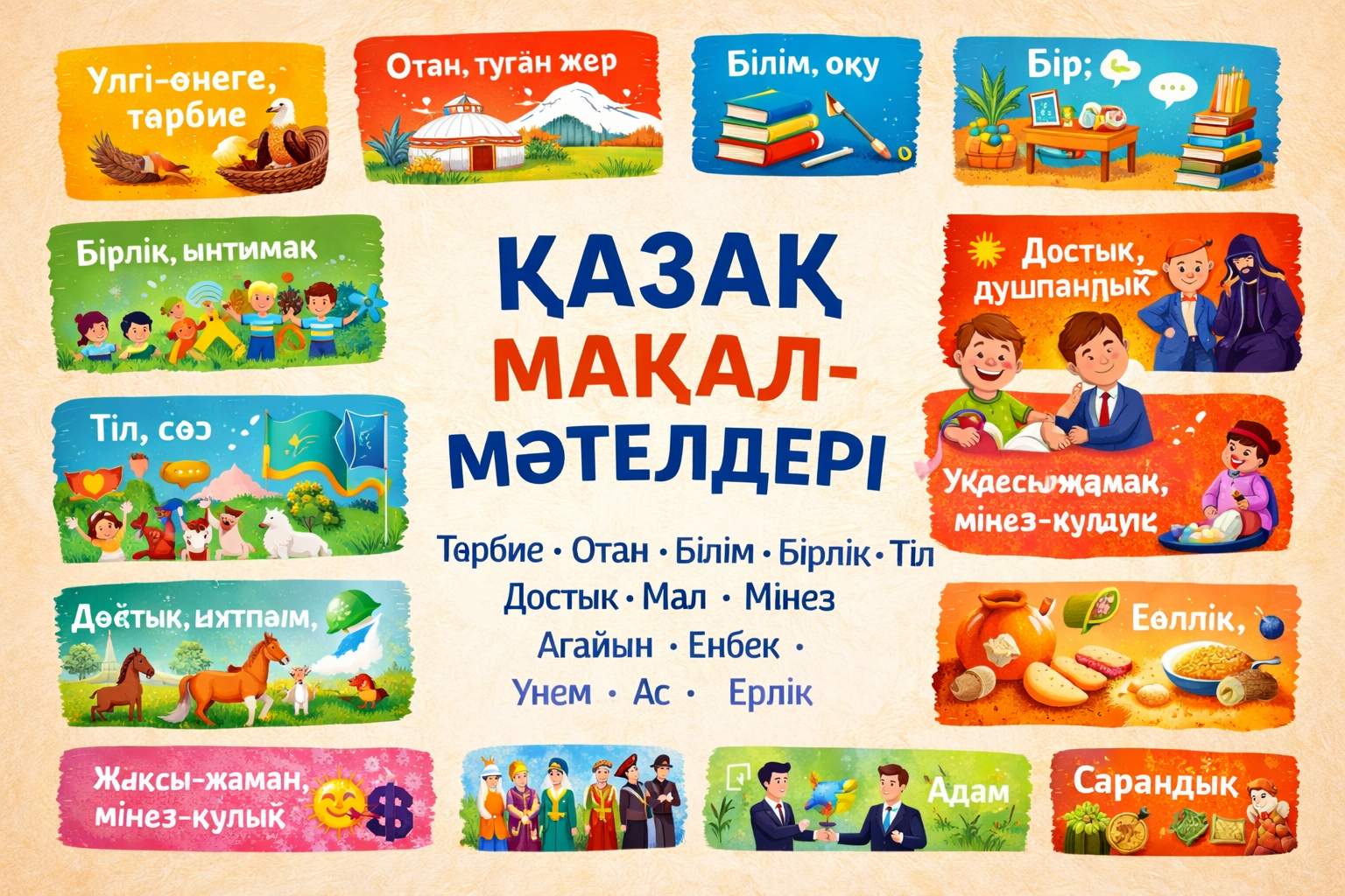 Қазақ халқының мақал-мәтелдері – ғасырлар бойы қалыптасқан даналықтың, тәрбие мен өмір тәжірибесінің көрінісі. Олар адамгершілікке, еңбекке, бірлікке, отансүйгіштікке, білімге, адалдыққа баулиды. Төменде мақал-мәтелдер негізгі тақырыптар бойынша топтастырылып берілді.